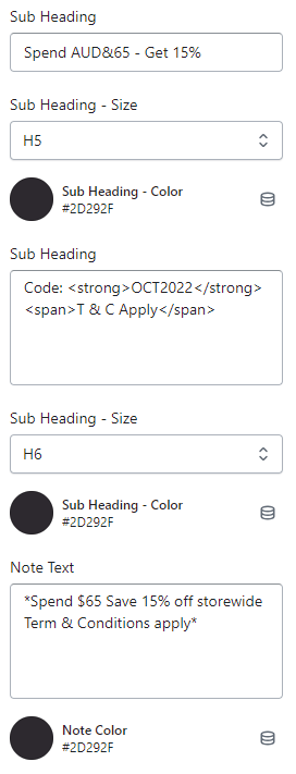 - To add or edit the displayed content, you can do so in the “Content – Setting” part. You will enter the content for Heading, Sub Heading, and Note text into the respective fields. After that, you can adjust the font size of each content by clicking on “Heading – Size,” “Sub Heading – Size,” and “Note Text ” You can also change the text color by clicking on the respective fields: “Heading – Color,” “Sub Heading – Color,” and “Note Text – Color.”