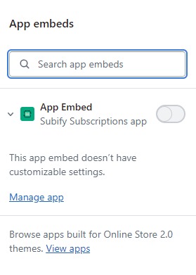 App embeds are elements provided by apps that either float, overlay, or add code to your online store without being visible to customers. They can include chat bubbles, analytics, tracking apps, and more. You can activate, deactivate, and customize app embeds through the theme editor, and they work with any theme version.