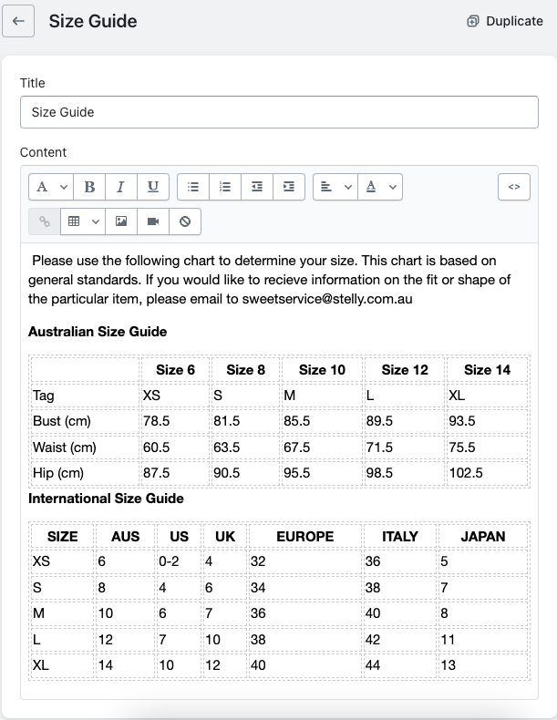 - For each guide option, you must create a page with name follow this format option name + guide (ex: Size Guide, Color Guide, etc)